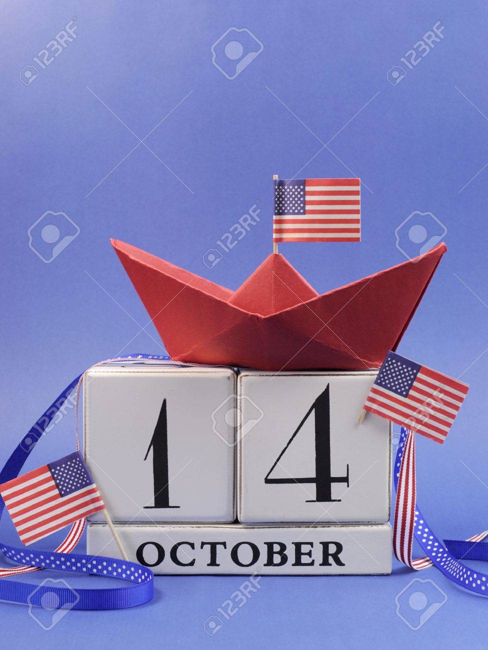Usa Holiday Happy Columbus Day For The Second Monday In October 14 October Celebration Save The Date Calendar With A Red Paper Boat And Stars And Strips Flags And Ribbons Decorations Stock
