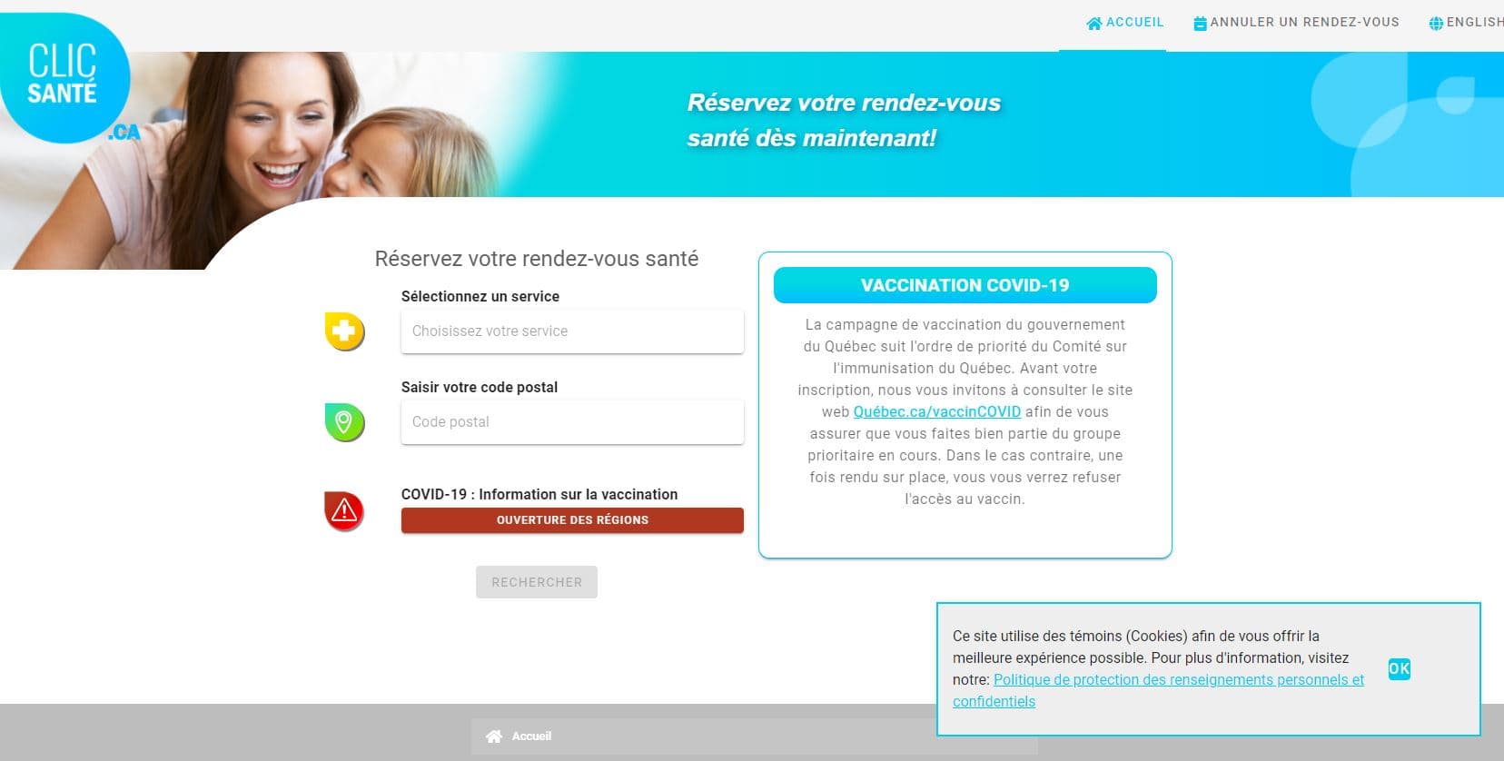 Clic sante rendez vous. À la première question cochez la ligne. Afin dassurer une plus grande traçabilité des données provinciales disponibles en matière de dépistage de la COVID-19 le ministère de la Santé et des Services sociaux MSSS centralise sur une seule et même plateforme provinciale soit le cv19quebecca la prise de rendez-vous et la trajectoire administrative des tests de dépistage de la COVID-19. La plateforme Clic Santé est la solution unique retenue pour la prise de rendez-vous pour cette campagne de vaccination.